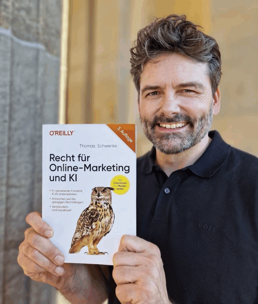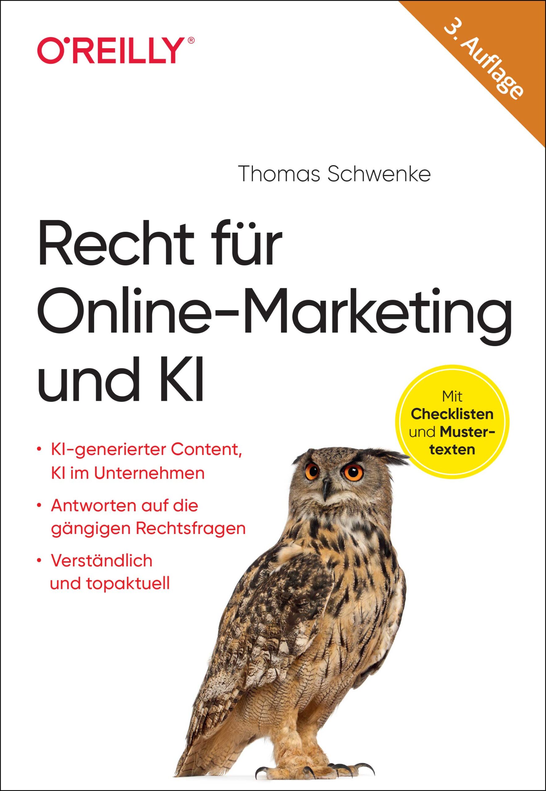 Falls Sie Online-Marketing nutzen oder Künstliche Intelligenz einsetzen wollen, sollten Sie sich vorab unbedingt mit den rechtlichen Rahmenbedingungen befassen. Das klingt nach lästigem „Pflichtprogramm“? Ist es nicht! – So mein Eindruck nach Lesen der dritten Auflage des Fachbuchs „Recht für Online-Marketing und KI“ von Rechtsanwalt Dr. jur. Thomas Schwenke. Sie möchten Details erfahren? Und sich einige Seiten anschauen? Sehr Gerne! (Foto Titel: Rheinwerk Verlag GmbH / O’Reilly, bereitgestellt vom Autor Dr. Thomas Schwenke)